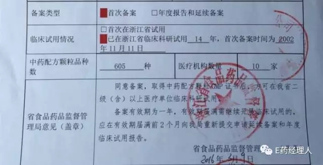 圖:2016年《浙江省中藥配方顆粒臨床試用備案表》