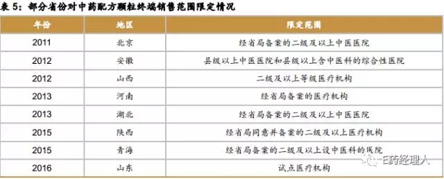 其實,關于中藥配方顆粒的銷售范圍,各地均不一。國家層面,2010年出臺了《關于規范中藥配方顆粒管理的通知》將試點機構設定為二級以上中醫醫院。而大部分省份在實施中,主要是“中藥配方顆粒的使用醫院必須經過省級藥監局批準并且備案”。其中廣東和安徽的放開尺度較大,廣東是所有醫療機構都可以使用,而安徽是縣級以上中醫醫院和縣級以上含中醫科的綜合醫院。
