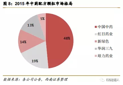 中藥配方顆粒自1987年天江藥業研發開始,到目前已經30年,長期被中國中藥(含天江、一方)、紅日藥業(康仁堂)、華潤三九(金蟾藥業)、新綠色、培力藥業5家企業壟斷。而市場規模從2010年的14.84億元擴張到2015年的近80億元,年均復合增速超過40%,是醫藥行業增速最快的子行業之一。