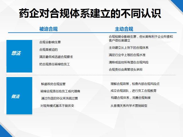 當前藥企對合規體系有兩種不同的認識,主動合規和被迫合規。一種認為合規限制的生意的發展,影響了市場,于是想盡各種辦法,通過偽造協議、轉嫁責任等方式躲避合規監管。主動合規的藥企認為長期有利于企業形象和客戶信任度建立,因此營銷重心從客情關系向學術營銷轉型,構建合規體系,完善合規制度。