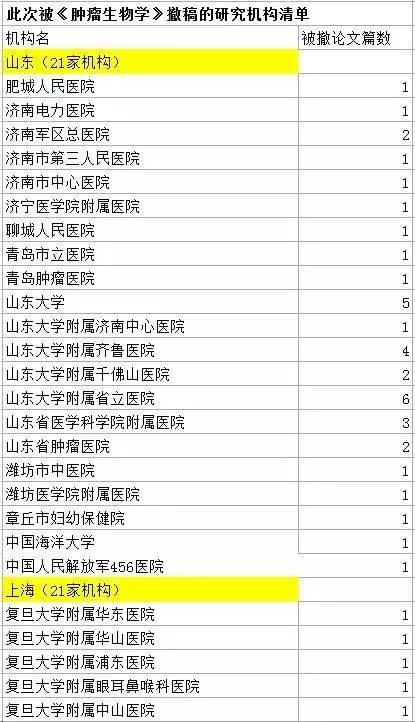 此次被《腫瘤生物學(xué)》撤稿的研究機(jī)構(gòu)清單
