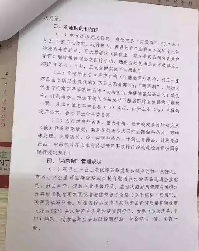 本方案印發之日起,啟動實施“兩票制”。2017年7月31日前為過渡期。過渡期內,藥品批發企業在本方案印發之前購進的庫存藥品,可按原規定(提供上一家企業藥品銷售票據和憑證)繼續銷售到公立醫療機構,確保醫療機構藥品有效供應。
