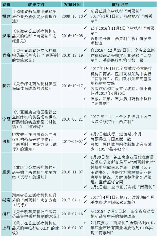 “衛計委專題工作座談會”再提“兩票制”時間表,也是衛生線對醫改重點工作的督辦。從11個醫改試點省份的“兩票制”推進情況看,截至4月27日,已有福建、安徽、陜西、重慶、青海、四川、湖南共7個省市出臺正式實施方案,寧夏仍停留于網傳版內部討論稿階段,江浙滬雖未發布“兩票制”正式文件,但均未停止醫藥流通領域相關改革。據了解,上海已有多家醫院開始對自身“兩票”與“非兩票”品種進行梳理、篩選,以承接“兩票制”政策。此外,非醫改試點省遼寧、甘肅、海南也正式發布了“兩票制”方案。