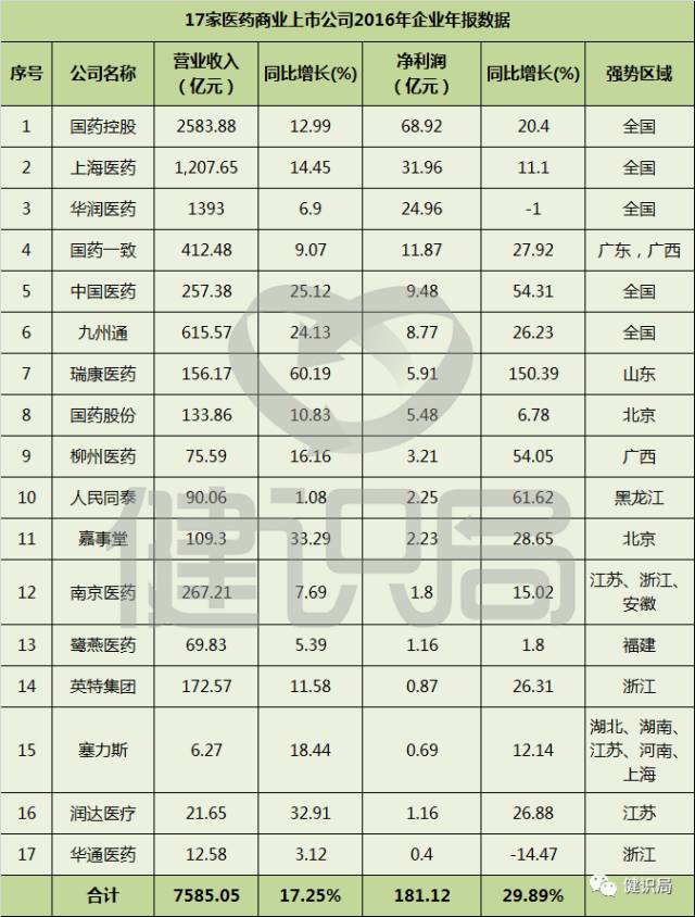 健識君梳理發現, 17家醫藥商業公司在2016年的總營收已突破7585.05億元,同比漲幅超過17.25%。根據商務部統計,2015年,全國藥品流通直報企業主營業務收入12625億元,扣除不可比因素同比增長10.9%。這幾家商業公司平均增長顯然還是不錯的。