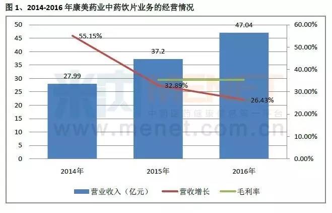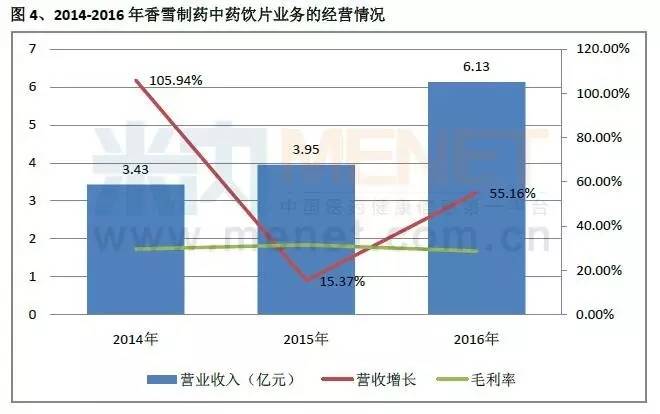 最近兩年,該公司的中藥配方顆粒業務均取得了不俗的成績,2016年突破了40億元的關口,毛利率也上漲至59.6%。中國中藥表示,天江藥業營業額增長勢頭良好,得益于國家政策支持中藥的發展,中藥配方顆粒參照中藥飲片的管理辦法,醫保覆蓋區域的增加,以及公立醫院保留對配方顆粒銷售的加成;其次,天江藥業以直銷和代理商兩種模式快速拓展市場,有效地掌握終端,全方位進行渠道維護,在全國各省份已形成比較完善的醫院覆蓋;第三,天江藥業提供給醫院使用的配藥機顯著增加,中藥配方顆粒臨床上量和營運效率大幅提高。