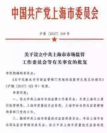 按照這份文件表述:上海市委同意“設立中共上海市市場監督管理工作委員會”,負責上海市工商行政管理局、上海市質量技術監督局、上海市食品藥品監督管理局等部門黨的工作。