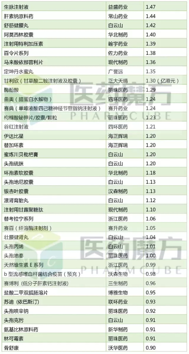 注:東阿阿膠公司的阿膠系列為53.71億元,華東醫(yī)藥的百令膠囊>20億元,卡博平>15億元,康恩貝的奧美拉唑腸溶膠囊>4.5億元。
