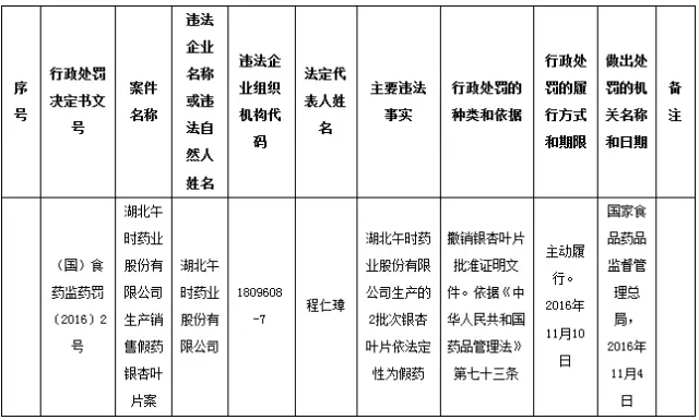 行政處罰信息公開表(湖北午時藥業股份有限公司生產銷售假藥銀杏葉片案)