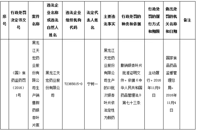 行政處罰信息公開表(黑龍江天宏藥業股份有限公司生產銷售假藥銀杏葉片案)