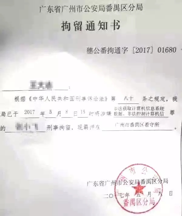 5月9日,財新記者獲得若干份《拘留通知書》照片,顯示黑客們涉嫌罪名多為“非法獲取計算機信息系統數據”、“非法控制計算機信息”等。這些《拘留通知書》的落款均為廣州市公安局番禺區分局,時間均為5月8日。