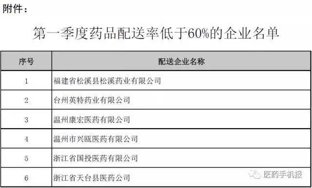 今日,浙江省藥械采購中心公布該省藥品交易平臺第一季度藥品配送率低于60%的6家配送企業名單。