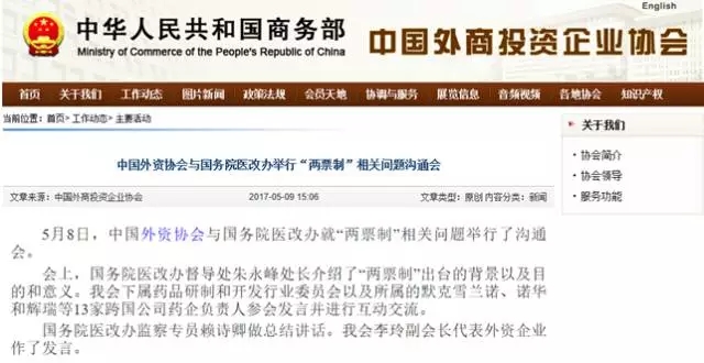 據中國外商投資企業協會網站消息,5月8日,中國外資協會與國務院醫改辦就“兩票制”相關問題舉行了溝通會。