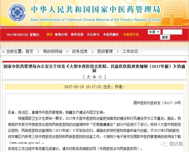 5月19日,國家中醫藥管理局印發《大型中西醫結合醫院、民族醫醫院巡查細則(2017年版)》(以下簡稱細則),再度加碼醫藥反腐。