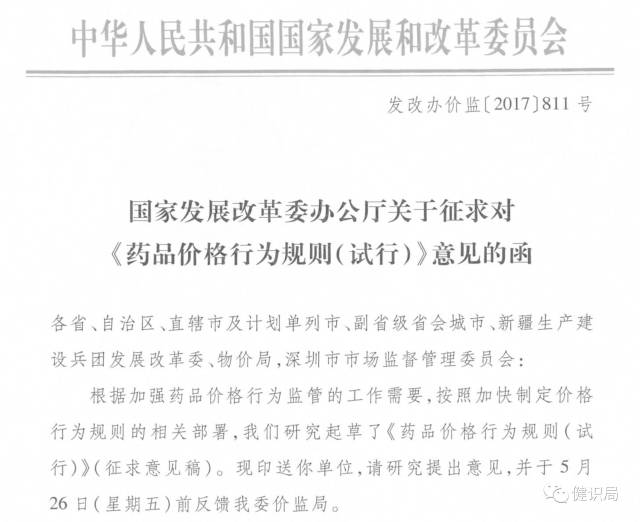 今日,一份蓋有國家發展改革委員會辦公廳公章主題為《關于征求對<藥品價格行為規則(試行)>意見》的文件在網上廣為流傳。通知顯示,該文件是發改委今年5月份向各省市有關單位征求意見的意見稿,5月26日為征求意見稿的截止日期。