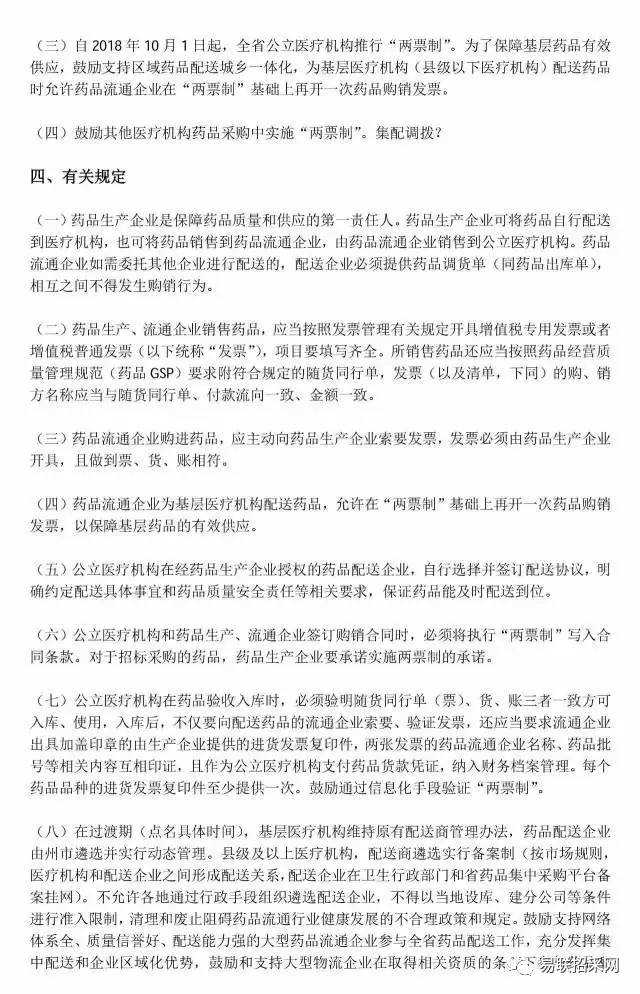 此過渡期內(nèi),為二級(jí)及以下公立醫(yī)療機(jī)構(gòu)配送藥品時(shí)允許藥品流通企業(yè)在“兩票制”基礎(chǔ)上再開一次藥品購銷發(fā)票。自2018年10月1日起,全省推行兩票制。另外還提到,基層醫(yī)療機(jī)構(gòu)可以再開一次發(fā)票。