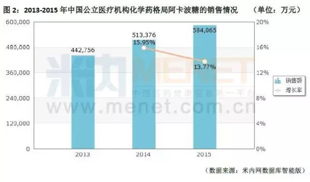 據(jù)米內(nèi)網(wǎng)數(shù)據(jù)顯示,2013-2015年中國(guó)公立醫(yī)療機(jī)構(gòu)化學(xué)藥格局中,阿卡波糖的整體銷售呈現(xiàn)快速增長(zhǎng)的趨勢(shì),2014與2015年的增長(zhǎng)率均超過(guò)10%。