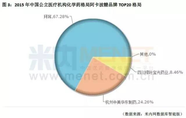 2015年中國(guó)公立醫(yī)療機(jī)構(gòu)化學(xué)藥格局中,阿卡波糖的銷售額超過(guò)58億元。該品種超過(guò)六成的市場(chǎng)被拜耳所占,但近幾年呈下滑趨勢(shì),其市場(chǎng)份額進(jìn)一步被后兩位的品牌蠶食,排第二位的中美華東市場(chǎng)份額增速迅猛,2015年漲至24.26%。