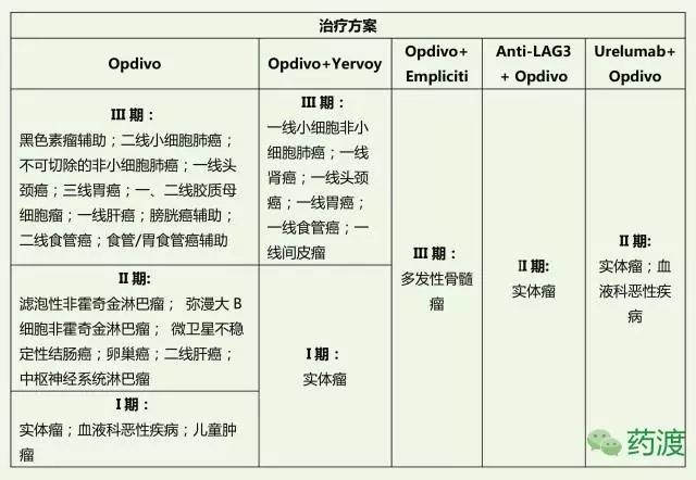 Opdivo (Nivolumab)是細胞程序性死亡受體1 (PD-1)抑制劑,小野公司與BMS聯合研發,自2014年底首次獲得FDA批準上市。2年內已獲得FDA 6項腫瘤適應癥的批準,其獲批準的適應癥包括:(1)不能手術切除或轉移性BRAF V600野生型黑色素瘤; (2) BRAF V600突變陽性的晚期或轉移性黑色素瘤;(3)與Yervoy聯用治療不可切除或轉移性黑素瘤;(4)對鉑類藥物化療不敏感或進展的轉移性非小細胞肺癌;(5)接受過抗血管生成治療的晚期腎細胞癌;(6)自體造血干細胞移植后、Adcetris治療后以及包括自體造血干細胞移植在內的系統治療后,復發或進展的經典霍奇金淋巴瘤成人患者;(7)鉑基療法治療后的頭頸部復發或轉移性鱗狀細胞癌;(8)在鉑類化療期間或之后有疾病進展的、在新輔助化療或鉑類化療輔助治療12個月內病情惡化的局部晚期或轉移性尿路上皮癌。處于臨床研究的適應癥如下表所示: