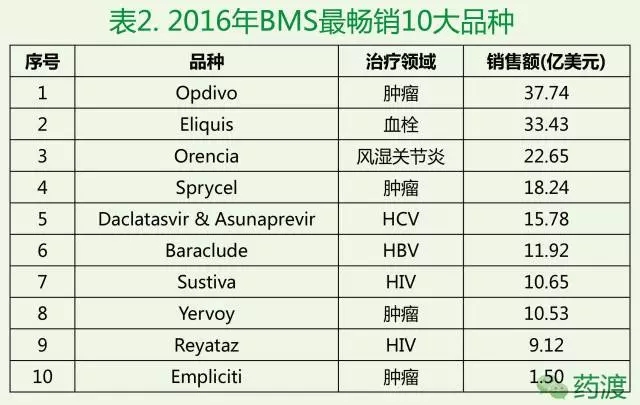 2017年第一季度BMS銷售增長前5品種在2016年BMS暢銷品種排行如下:Opdivo第1名、Eliquis第2名、Yervoy第8名、Sprycel第4名、Orencia第3名,2016年BMS最暢銷品種前10名如下表所示: