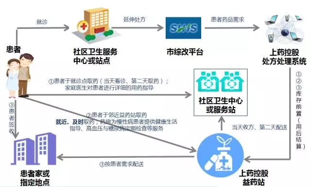 凡是簽約居民由社區醫生轉到上級醫院就醫的,在大醫院得到的處方即使不在基層藥物目錄之內,也可以在社區醫生處直接開方,由物流公司配送到社區或居民家中。
