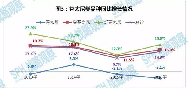 由于舒芬太尼及瑞芬太尼在臨床上越來越多地獲得認可,芬太尼市場增速逐漸放緩,較整個麻醉鎮痛藥物市場平均增速較低,且有繼續下滑的趨勢。