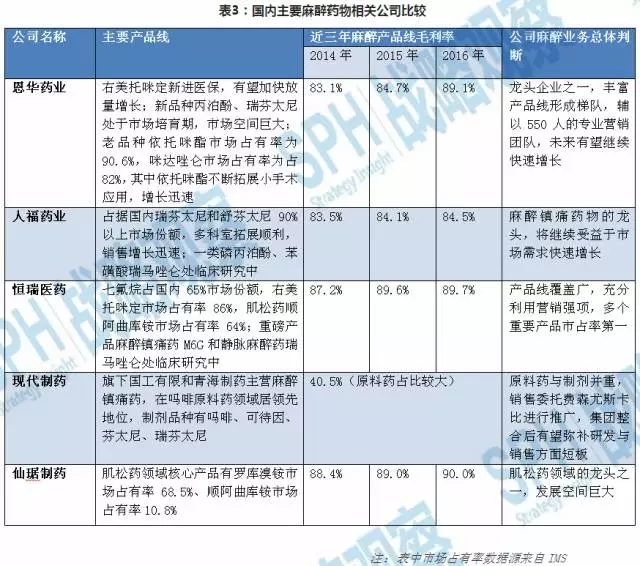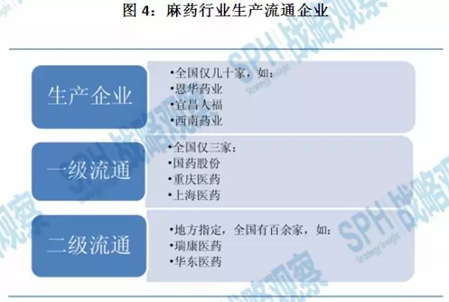 麻藥市場由于其特殊性,天然具備高壁壘特征,從生產-經營-使用由國家嚴格監管。CFDA規定,麻醉藥品同品種原料藥定點生產商有1-2家,同品種單方制劑生產商有1-3家,含主要品種的復合制劑生產商有1-7家。從經營企業來看,目前只有三家國藥股份、上海醫藥和重慶醫藥為全國性麻醉藥品一級分銷商。麻醉藥品和第一類精神藥品由國家發改委實行最高出廠價格和最高零售價格管理,不實行招標采購,醫療機構如需麻醉藥,須憑審批的購用印鑒卡向定點批發企業采購。