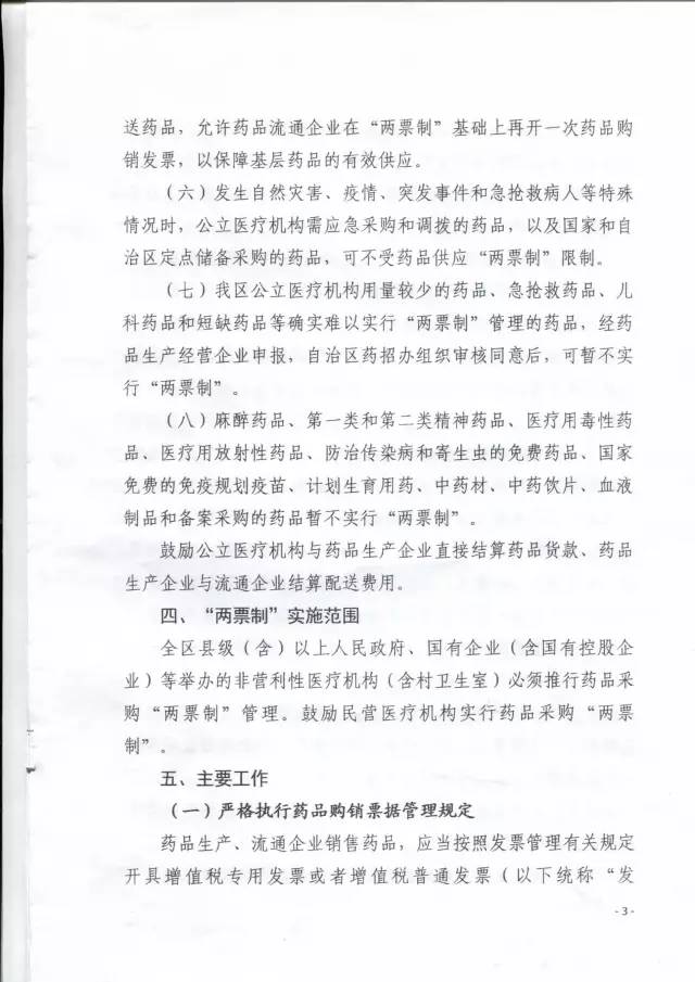 醫療機構索要的“兩票”指藥品生產企業或視同為生產企業的經營企業(代理商)開具給流通企業的一次購銷發票(第一票),以及流通企業開具給醫療機構的一次購銷發票(第二票)。如存在政策允許的內部一次調撥或(和)鄉鎮衛生院根據實際情況增加一票,調撥或(和)增加的一票所產生的購銷發票視為政策允許的一次購銷發票(第三票),符合我區“兩票制”試行規定。