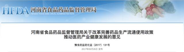 26日,河南省食藥監局網站公布《河南省食品藥品監督管理局關于改革完善藥品生產流通使用政策推動醫藥產業健康發展的意見》(豫食藥監藥化監〔2017〕131號)(下稱《意見》),在全國范圍內首次提出: