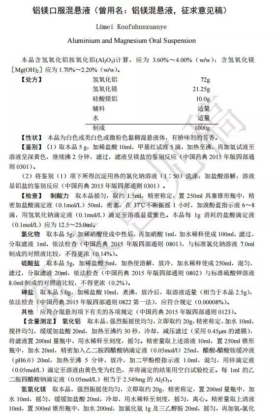 關于鋁鎂口服混懸液(曾用名:鋁鎂混懸液)標準的公示