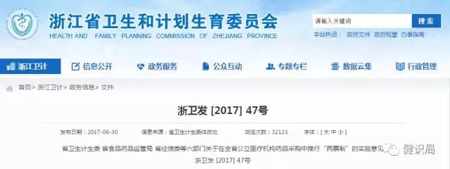 浙江本省所有的公立醫療機構都需要執行兩票制,自2017年8月1日起實施,過渡期至2017年10月31日。