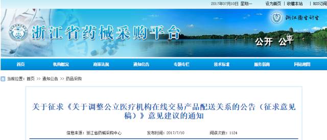 為貫徹落實《省衛生計生委等六部門關于在全省公立醫療機構藥品采購中推行“兩票制”的實施意見》(浙衛發〔2017〕47號)等文件精神,按浙江省藥品集中采購工作領導小組辦公室統一安排,現將《關于調整公立醫療機構在線交易產品配送關系的公告(征求意見稿)》公開征求意見建議。