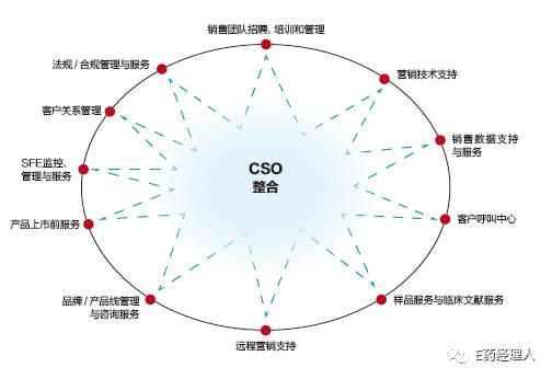 在藥品銷售合作方面,第三方的專業銷售外包組織(CSO)通常能表現出完全不一樣的競爭力。一般來說,這類企業通常保持了適度的規模,其核心運作以及組織架構基本上完全為營銷的需要而量身定做,不僅能為制藥企業的新產品制定和執行早期的產品上市計劃,同樣也能促進成熟產品的銷售延長其產品生命周期。
