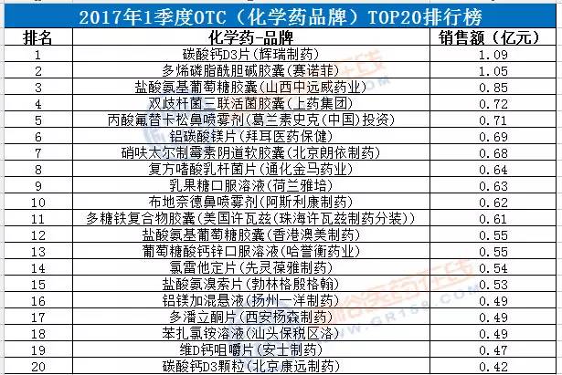 2017年1季度OTC藥品TOP20品牌排行榜!