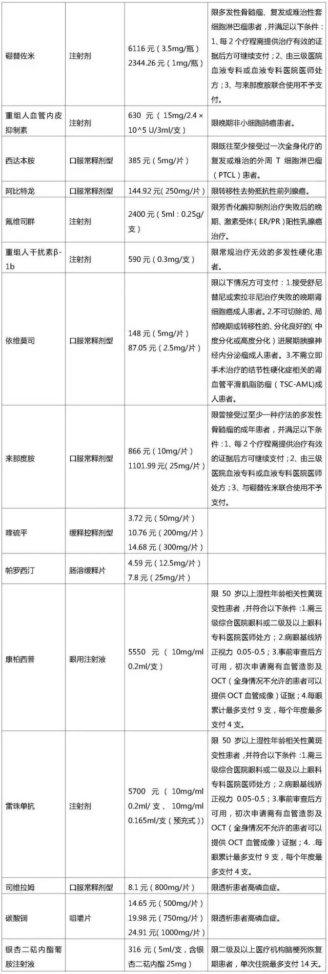 二、附表“醫(yī)保支付標準”一欄規(guī)定的支付標準包括基本醫(yī)療保險基金和參保人員共同支付的全部費用,基本醫(yī)療保險基金和參保人員的分擔比例由各統(tǒng)籌地區(qū)確定。規(guī)定的支付標準有效期截至2019年12月31日,有效期滿后按照醫(yī)保藥品支付標準有關(guān)規(guī)定進行調(diào)整。有效期內(nèi),如有同通用名稱藥品(仿制藥)上市,我部將根據(jù)仿制藥價格水平調(diào)整該藥品的醫(yī)保支付標準并另行發(fā)布;如出現(xiàn)藥品市場實際價格明顯低于現(xiàn)行支付標準的,我部可以與企業(yè)協(xié)商重新制定支付標準并另行發(fā)布。
