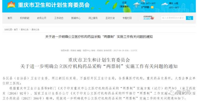 2017年6月,重慶市衛計委印發《關于進一步明確公立醫療機構藥品采購“兩票制”實施工作有關問題的通知》要求,公立醫療機構2017年6月1日起下達訂單的藥品必須實行“兩票制”。