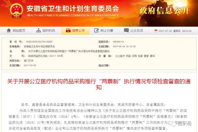 2017年4月24日,安徽省衛計委印發《關于開展公立醫療機構藥品采購推行“兩票制”執行情況專項檢查督查的通知》,決定對全省藥品批發(配送)企業和公立醫療機構藥品采購執行“兩票制”情況進行專項檢查和督查。