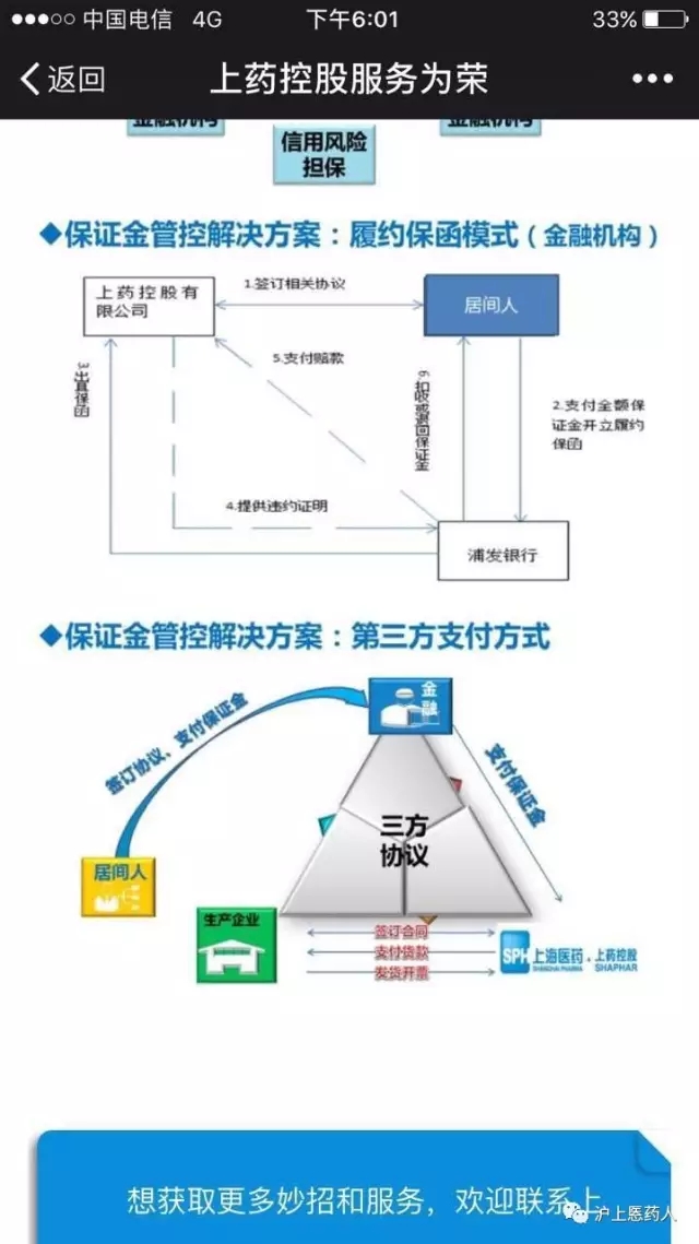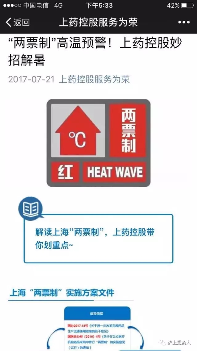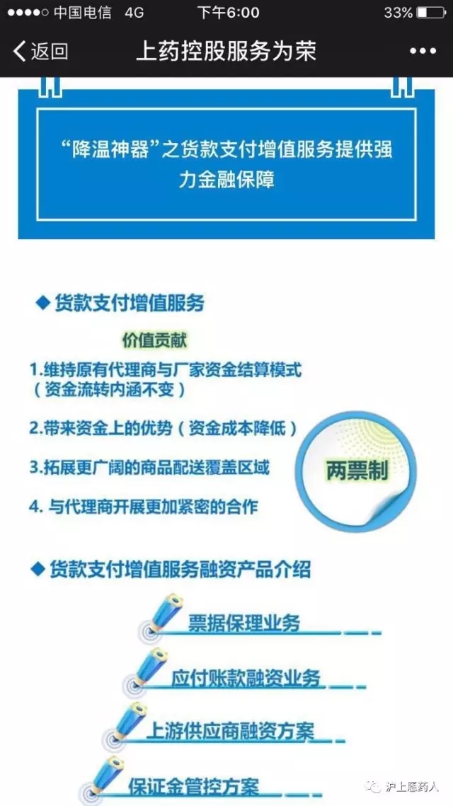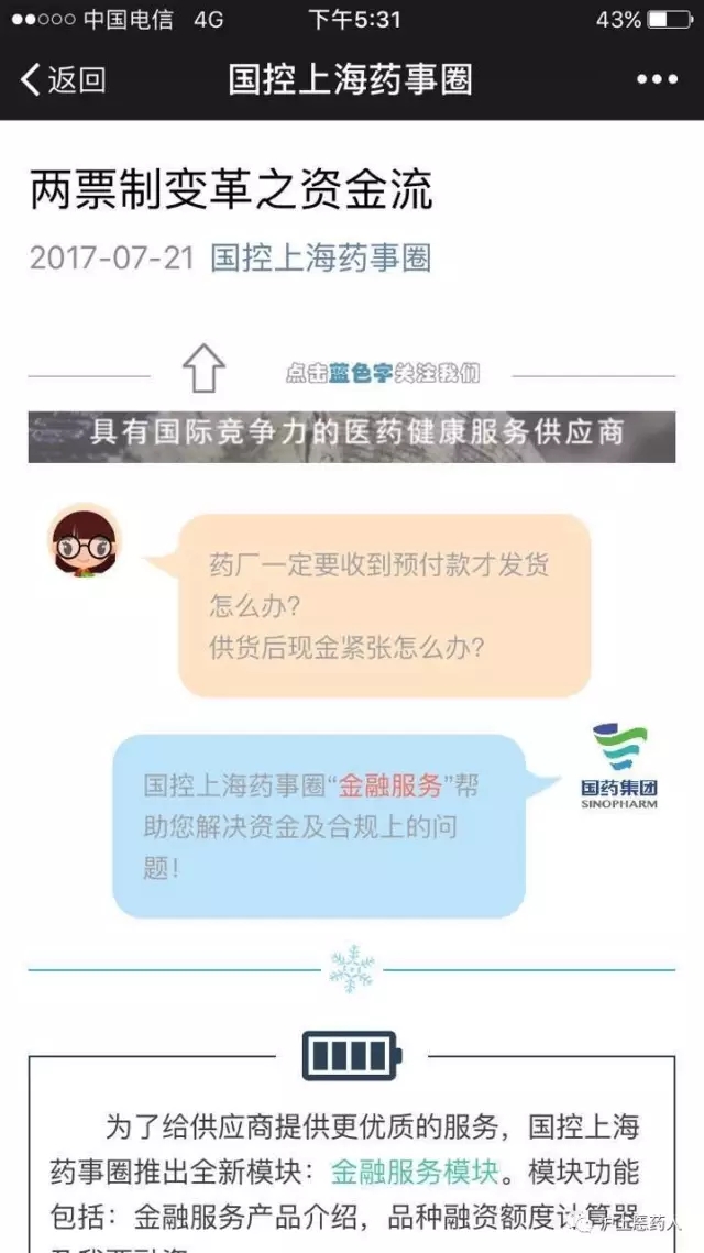 剛剛,國控、上藥在上海懟上了。 今日“國控上海藥事圈”剛發布“兩票制變革之資金流”,“上藥控股服務為榮”緊跟著就發布了—“兩票制高溫預警,上藥控股妙招解暑”,就兩家發布消息內容來看:兩家均就“兩票制”影響下的供應商資金融通提出了自己的解決方案,方案各具千秋。這廂里國控推“金融服務”;那廂里上藥送“金融保障”。 國控、上藥推出的此類增值服務對企業供應商來說是件好事,誰服務好?我找誰!只有市場競爭充分,才能催生更好服務。國控、上藥,擼起袖子,加油干吧!