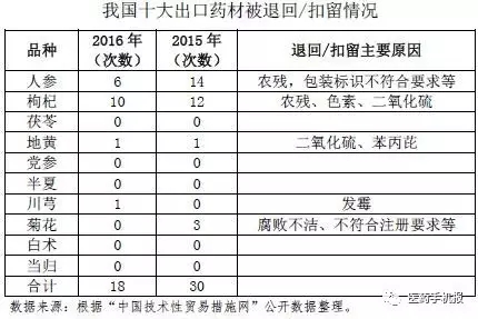 2016年,我國出口藥材整體質量明顯提升。其中,2016年出口額排名前10的品種,因質量等問題被日本、美國、歐盟、韓國扣留或退回18次,比2015年的30次下降40%。