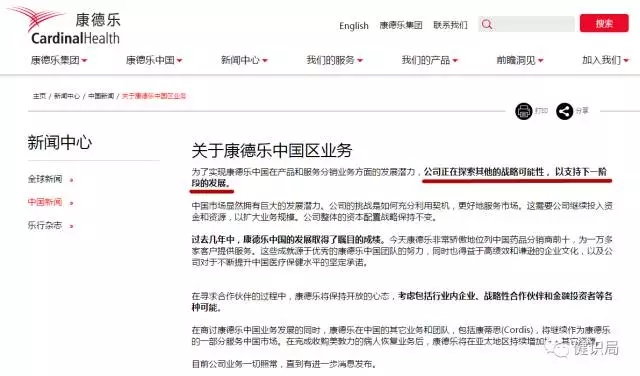 康德樂中國于今早(21日)在其官網(wǎng)上發(fā)出聲明稱,為了實現(xiàn)公司在產(chǎn)品和服務(wù)分銷業(yè)務(wù)方面的發(fā)展?jié)摿Γ菊谔剿髌渌膽?zhàn)略可能性,以支持下一階段的發(fā)展。