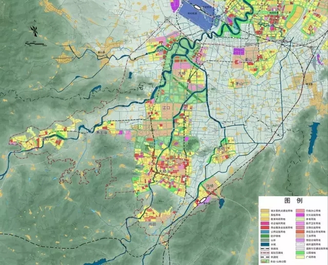 規(guī)劃布局遵循“精明增長”和“宜居家園”兩大發(fā)展理念。一是從粗放發(fā)展到精明增長,建設(shè)綠色生態(tài)示范區(qū),城市發(fā)展采取順應(yīng)山水格局的組團(tuán)式布局,組團(tuán)之間布置生態(tài)通風(fēng)廊道,避免連綿式發(fā)展,嚴(yán)格劃定生態(tài)紅線和城鎮(zhèn)開發(fā)邊界,將海綿城市、緊湊城市、TOD發(fā)展理念落實(shí)到規(guī)劃布局中。二是從增長機(jī)器到宜居家園,建設(shè)山水田園樂活城,采取山水入城、田園圍城、樂活營城的規(guī)劃理念,將山水引入城市,使城市與鄉(xiāng)村田園交融,營造樂活文化氛圍。