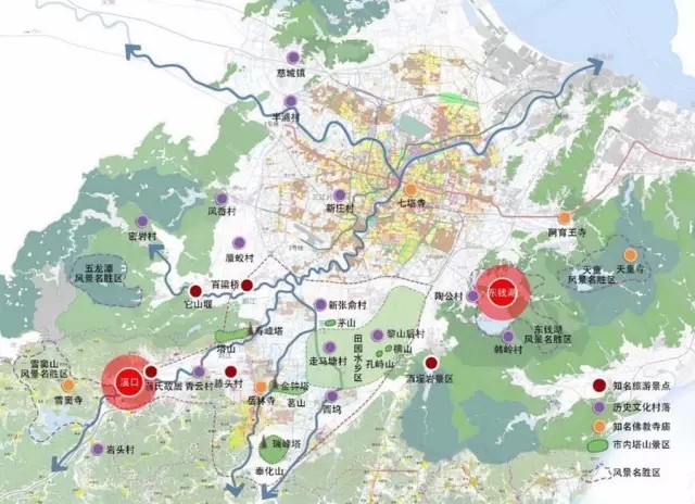 兩翼六鎮(zhèn):兩翼即城市發(fā)展西側(cè)的山水旅游區(qū)和東側(cè)的水鄉(xiāng)田園區(qū)。西翼旅游休閑區(qū)包括溪口、蕭王廟2個(gè)特色小鎮(zhèn)和大片山水景觀區(qū);東翼水鄉(xiāng)田園區(qū)包括西塢、尚橋、尚田、茅山4個(gè)特色小鎮(zhèn)和大片水鄉(xiāng)田園景觀區(qū)。