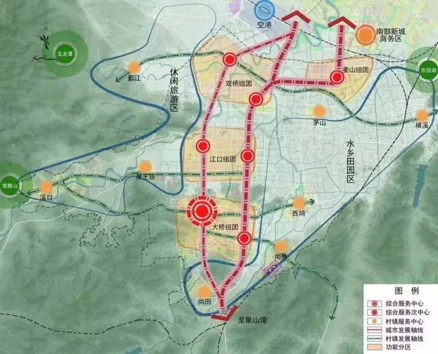 一帶四團(tuán):依托城市軌道和主干道路,由中心城區(qū)向南,串聯(lián)雙橋、姜山、江口、大橋四個(gè)精品城市組團(tuán),形成組團(tuán)式布局的城市發(fā)展帶。