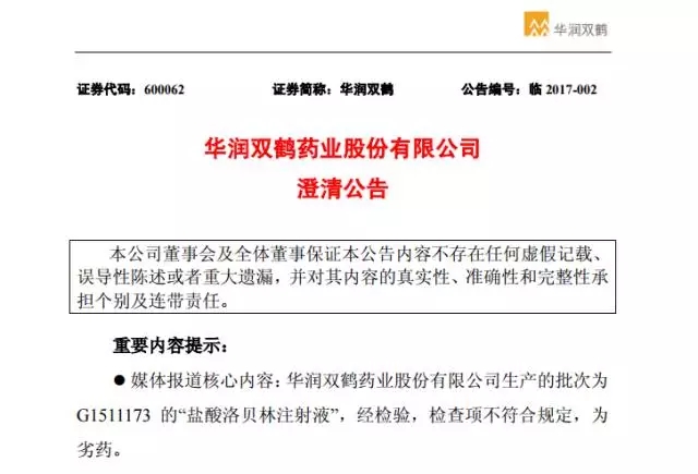 公開資料顯示,2017年1月3日,華潤雙鶴藥業曾經就鹽酸洛貝林注射液抽檢不合格發過澄清聲明。