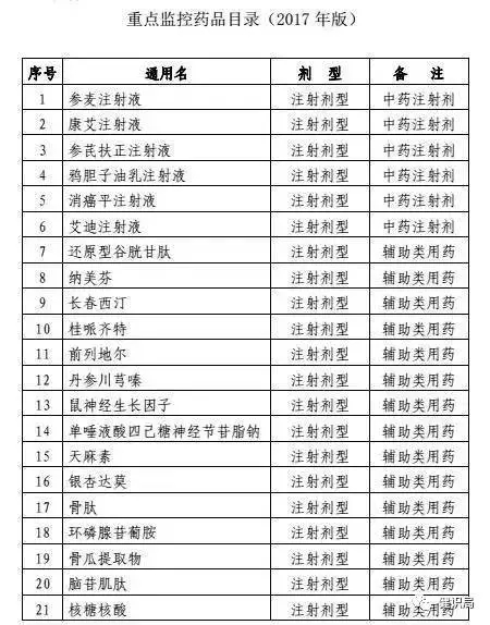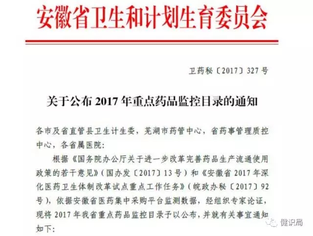 7月26日,安徽省醫(yī)藥采購(gòu)平臺(tái)轉(zhuǎn)發(fā)安徽衛(wèi)計(jì)委公布的2017年重點(diǎn)監(jiān)控品種的清單,共有60個(gè)品規(guī)的藥品被納入重點(diǎn)監(jiān)控目錄,以通用名計(jì)算,只有41個(gè)品種。