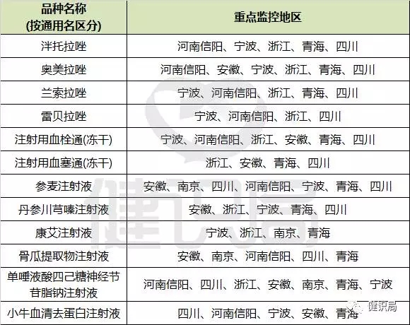 下面是文中涉及的省市重點(diǎn)監(jiān)控品種清單,因?yàn)榍嗪F贩N較多,故略去,詳情可點(diǎn)擊《326種藥品被重點(diǎn)監(jiān)控!大企業(yè)、大品種居多》進(jìn)行查看。