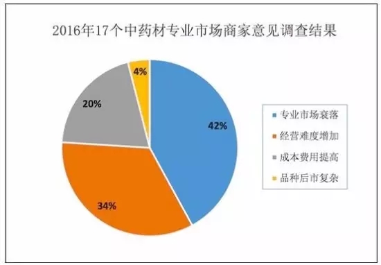2016年,針對全國17個中藥材專業市場的調查顯示,42%的受訪商家表示傳統專業市場正在衰落,34%的受訪商家表示經營難度比與過去明顯增加。