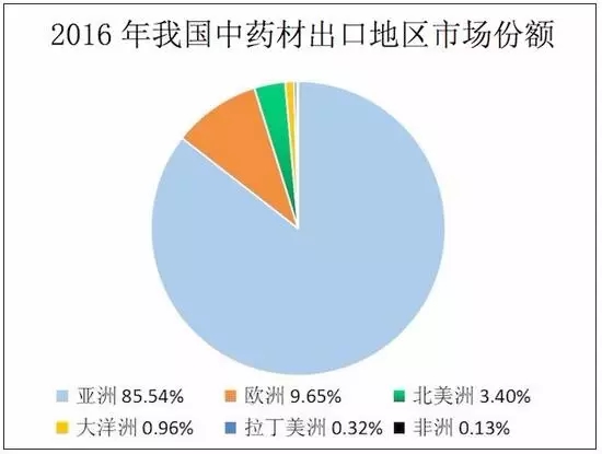我國中藥材出口地區高度集中,亞洲依然是最主要的出口地區。2016年我國對亞洲地區的中藥材出口額約8.77億美元,占我國中藥材出口總額的85.54%。