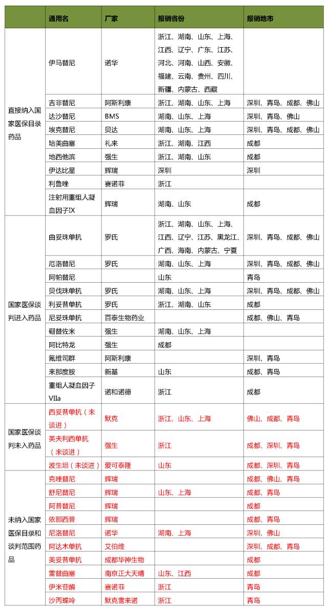 根據地方政府部門公開文件不完全統計(除伊馬替尼和曲妥珠單抗,其他品種統計省市/地市僅為浙江、湖南、山東、上海、成都、深圳、佛山、青島、江西)