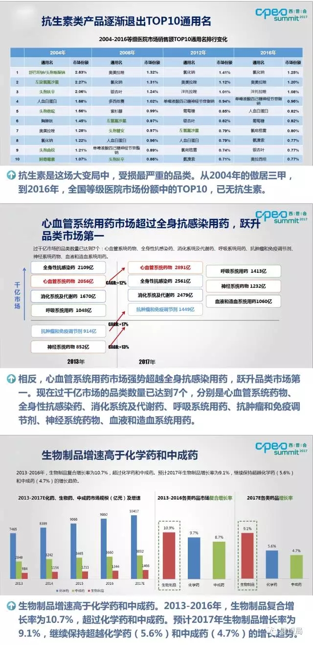“2017年西普會”上發布的《六大終端市場結構與轉移趨勢》顯示,2016年,中國藥品最主要銷售終端——等級醫院中,抗生素的市場份額,已經退出top10;而迫于各地各級衛生部門的“限抗令”,大輸液品種銷量明顯下滑,中藥注射劑市場增速下降。