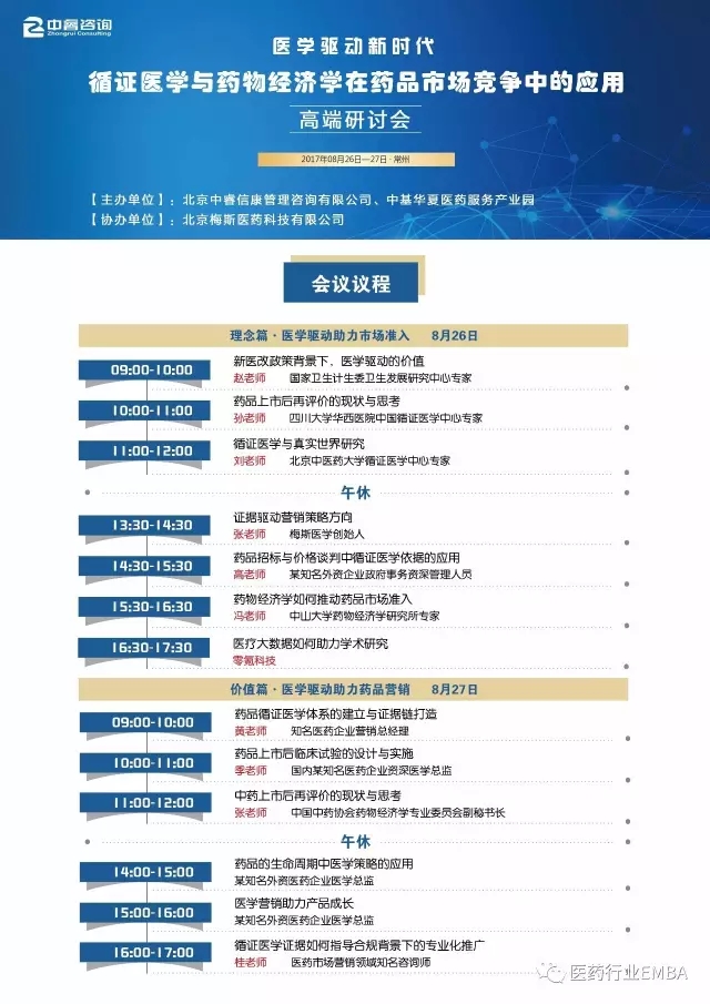 8月26日至27日,中睿咨詢將在常州再一次舉辦高端研討會,此次研討會的主題為“醫(yī)學(xué)驅(qū)動新時(shí)代——循證醫(yī)學(xué)與藥物經(jīng)濟(jì)學(xué)在藥品市場競爭中的應(yīng)用”。具體的研討會課題議程及邀請師資,見下圖: